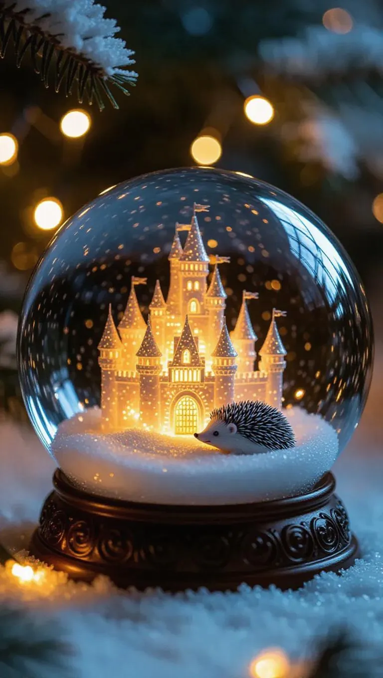 a small, glowing snow globe, illuminated by bright, cheerful light. Inside, a miniature ice castle twinkles with vivid details, surrounded by a flurry of soft snowflakes, with a tiny hedgehog curled up in the snow, creating a cozy and enchanting winter scene.