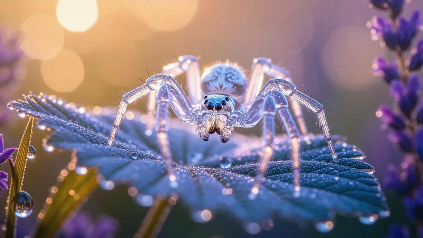 A delicate crystal spider perched on a frosted leaf, legs crafted from transparent ice with intricate, shimmering patterns, glowing softly in the gentle morning light, surrounded by dewdrops that sparkle like diamonds on a vibrant meadow filled with wildflowers.