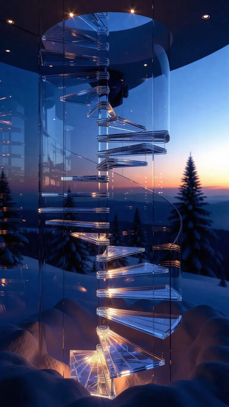 A spiraling staircase crafted from frosted glass and shimmering ice crystals, ascending into a vast, snowy sky, illuminated by harsh, ethereal light, creating a magical and otherworldly atmosphere