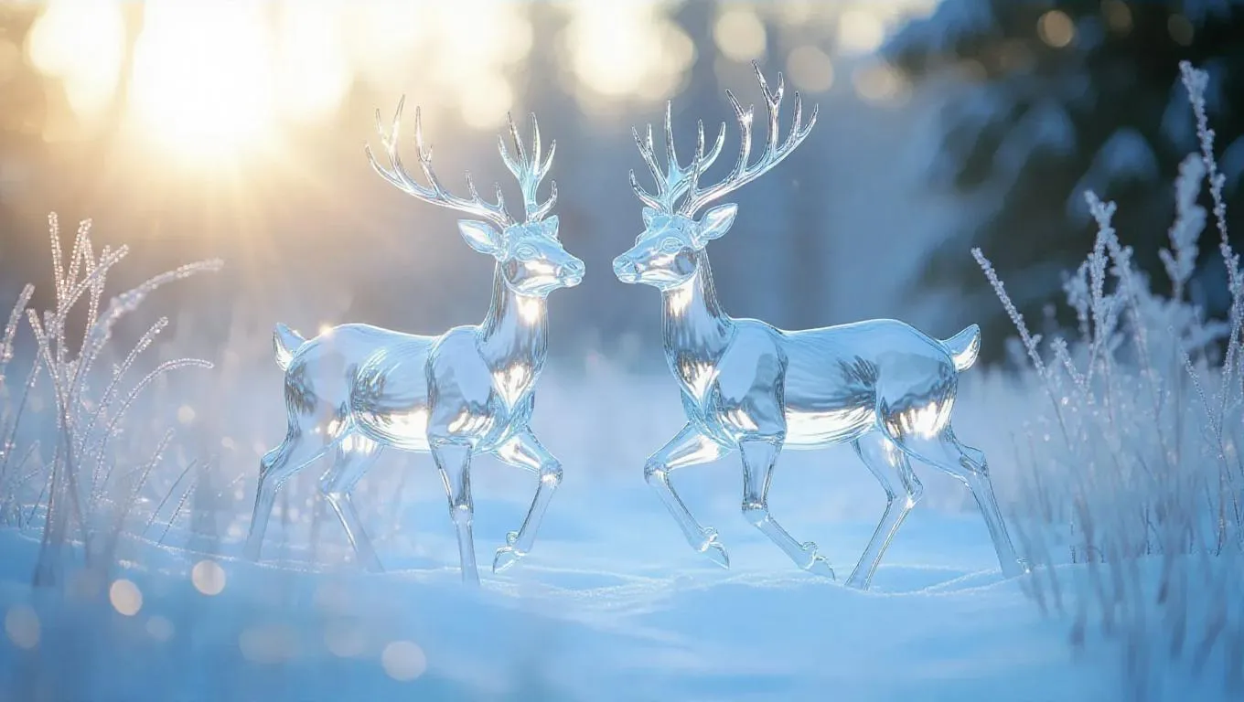 A pair of ethereal crystal deer gracefully walking through a serene icy meadow, their translucent bodies shimmering as they catch the bright rays of the noon sun, creating a magical and frosty ambiance