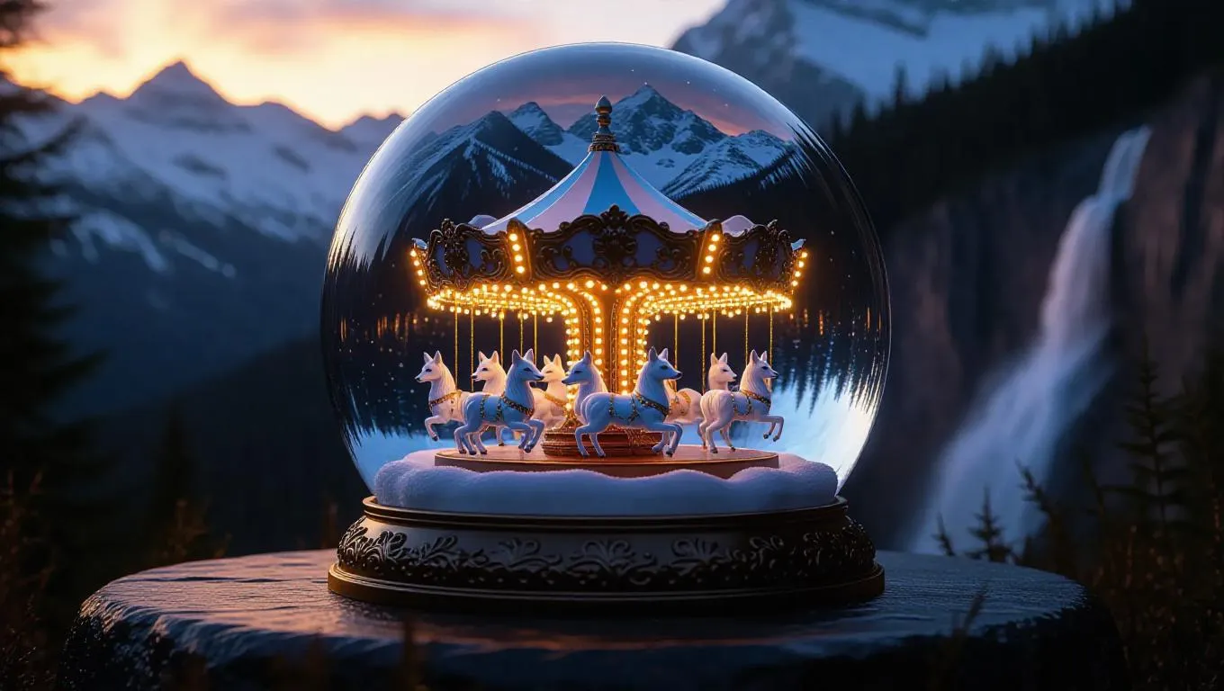 A magical snow globe encasing a spinning carousel crafted from sparkling crystal foxes and glowing sunset lights, set against a tranquil mountain backdrop with cascading waterfalls, evoking a sense of peace and harmony