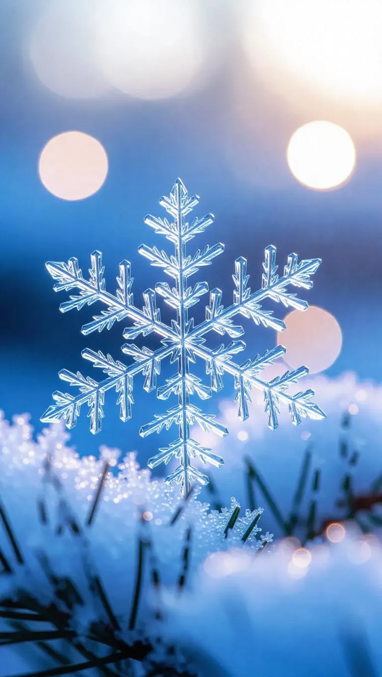 A delicate snowflake close-up, formed entirely from intricate crystal patterns, blending into a winter landscape, illuminated by soft, ethereal light, with a frosty, shimmering glow, capturing the essence of winter's beauty