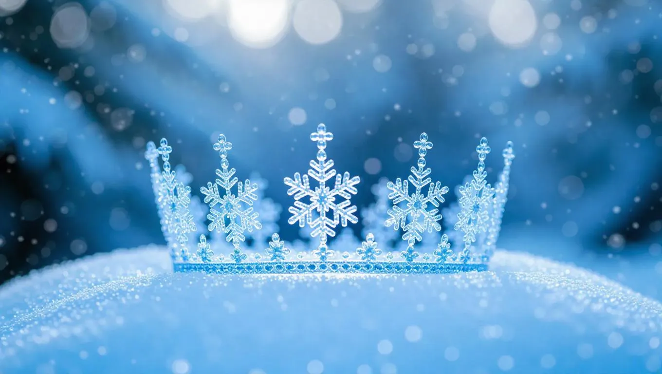 A delicate crown crafted from frosty snowflakes and sparkling icy crystals, gently resting on a plush pillow of pristine snow, surrounded by a frosty mist that adds a magical aura to the scene