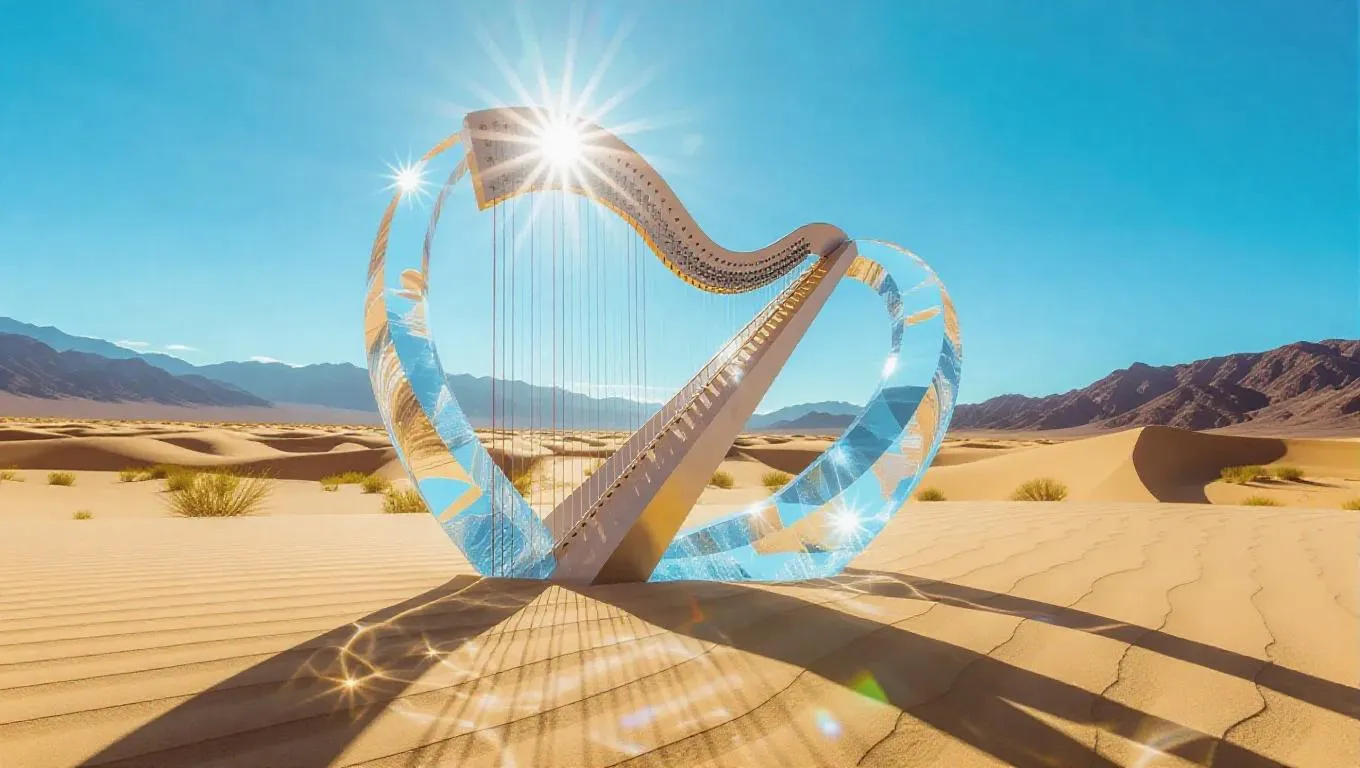 A mystical ice crystal harp arching gracefully over a desolate desert, shimmering under the scorching sun, with ethereal sand patterns shifting in the wind, creating a spellbinding arid oasis.