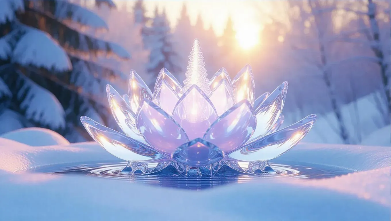 A majestic frozen fountain shaped like a flower, water suspended mid-motion in delicate crystal petals, surrounded by a blanket of snow, with pastel light casting a gentle warmth, emphasizing the intricate ice formations against a backdrop of a serene frosty ravine.