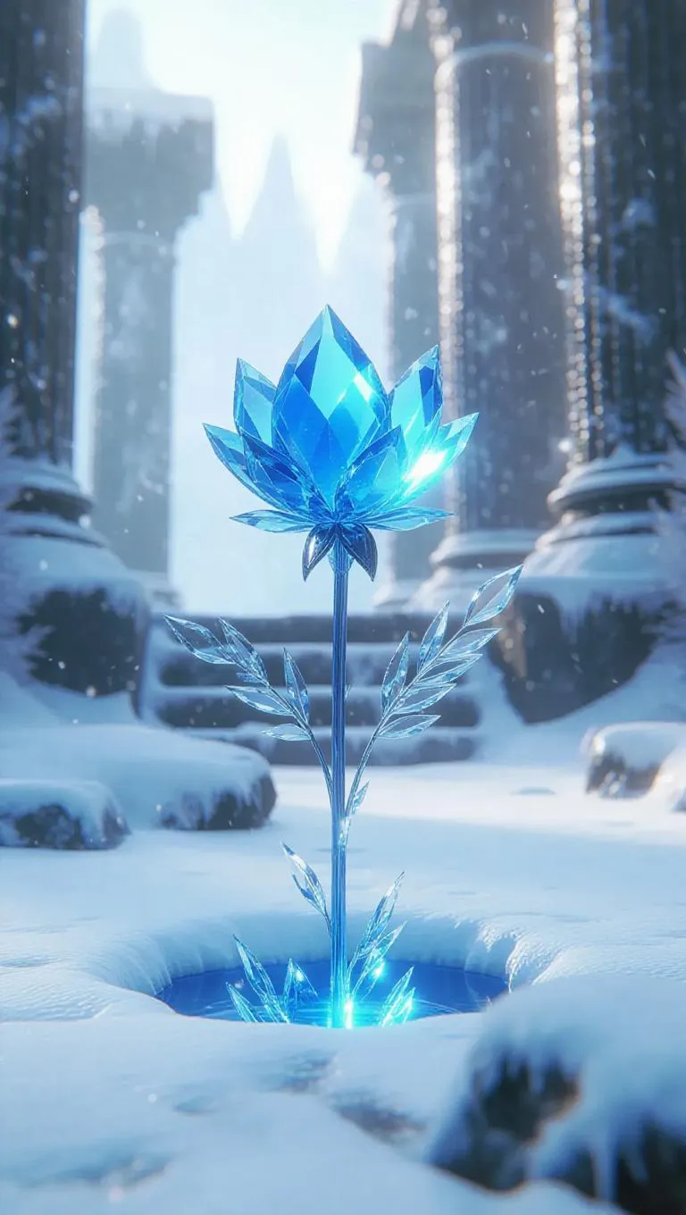 A single ethereal blue crystal flower emerging from a fissure in the icy ground, encircled by delicate, sparkling ice crystals. The flower radiates a subtle glow, casting a magical aura over the frosty ruins of a forgotten temple, where icy pillars rise from the snow-covered floor.