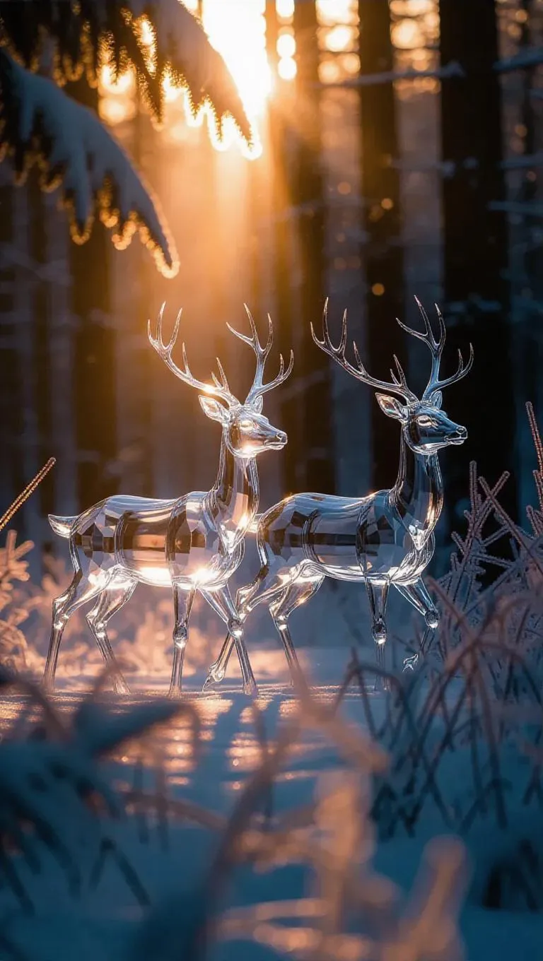 A pair of ethereal crystal deer gracefully walking through a shadowy frozen grove, their translucent bodies shimmering as they catch the soft rays of the morning sun, creating a magical and frosty ambiance