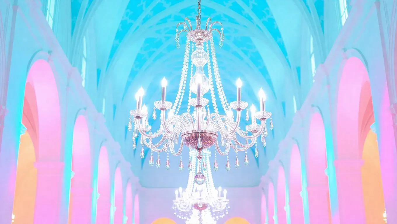 An ornate chandelier crafted entirely from shimmering glass beads, suspended in a vibrant colored hall with soaring vaulted ceilings, reflecting a mesmerizing array of light and shadows, creating an ethereal, cheerful