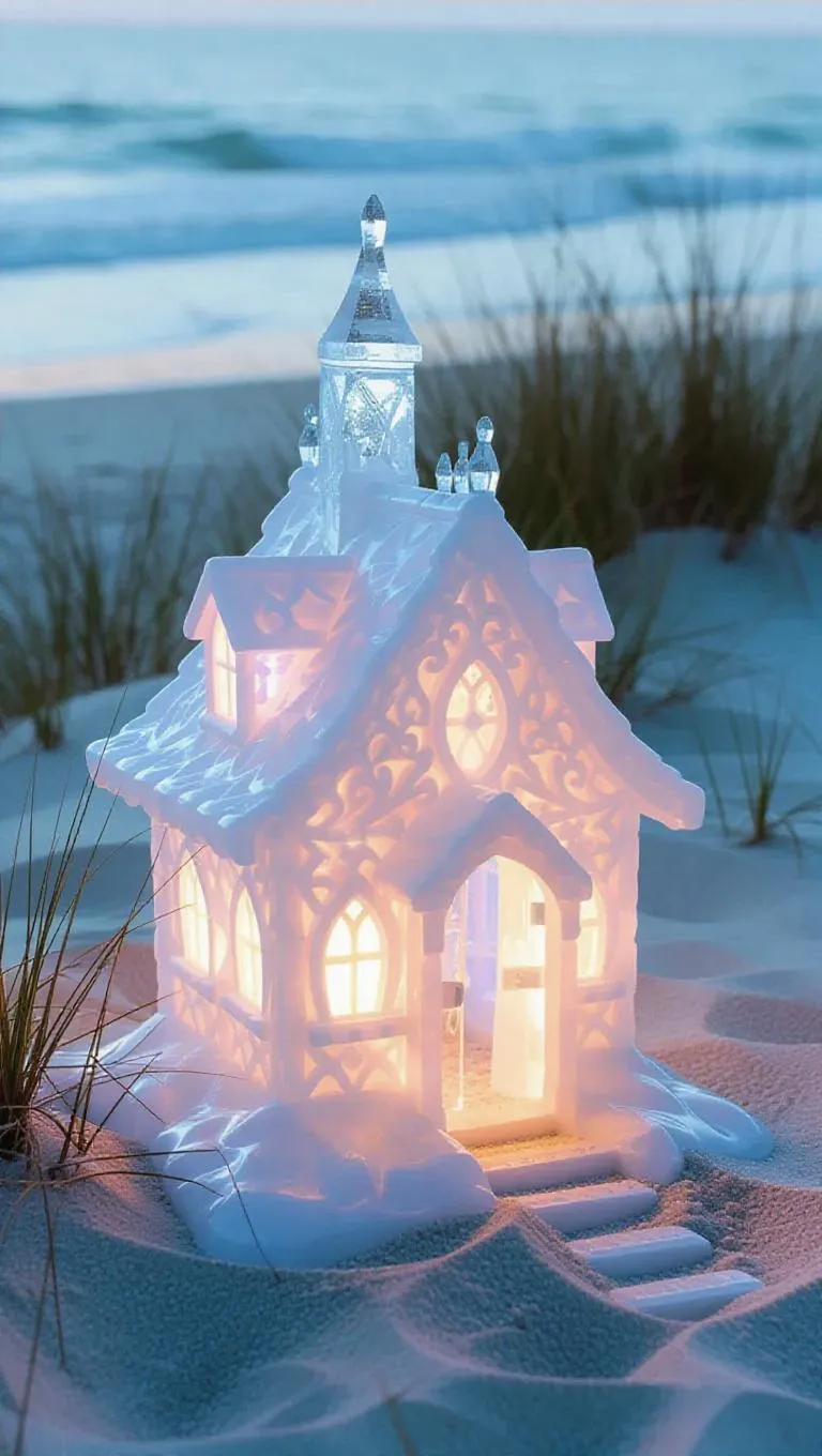 A delicate fairy house crafted from intricately carved ice, featuring glowing crystal windows that shimmer with ethereal light, nestled in a coastal dune, surrounded by sandy beaches and crashing waves