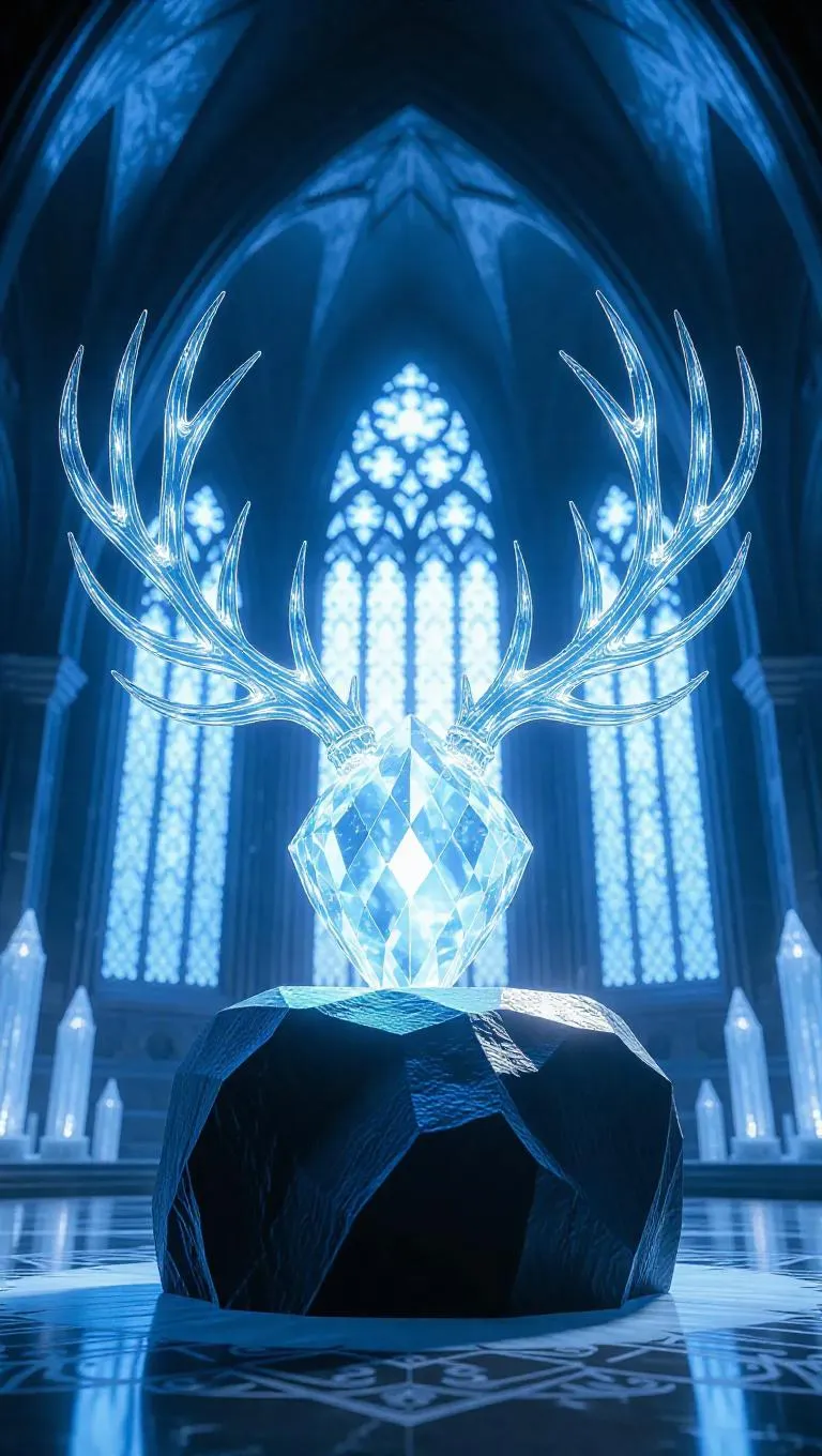 A pair of intricate crystal antlers, set atop a decorative stone in a grand ice cathedral, glowing with subtle silver light, surrounded by towering stained ice windows and icy arches, creating a sacred and otherworldly atmosphere, set in an awe-inspiring, frozen sanctuary with intricate reliefs and ethereal light patterns.