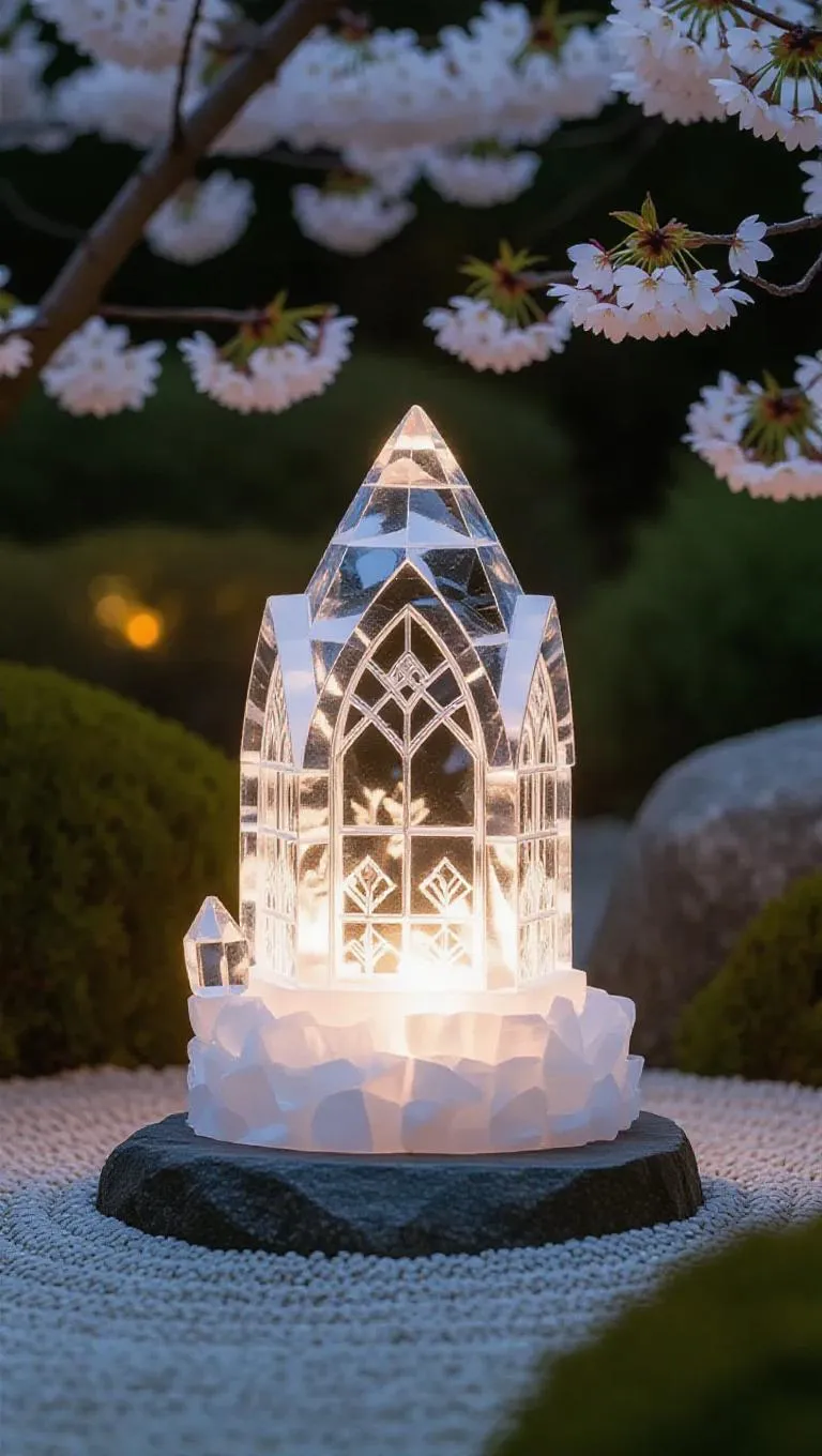 A delicate fairy monument crafted from intricately carved ice, featuring glowing crystal windows that shimmer with ethereal light, nestled in a tranquil Zen garden, surrounded by raked gravel and blooming cherry blossoms.