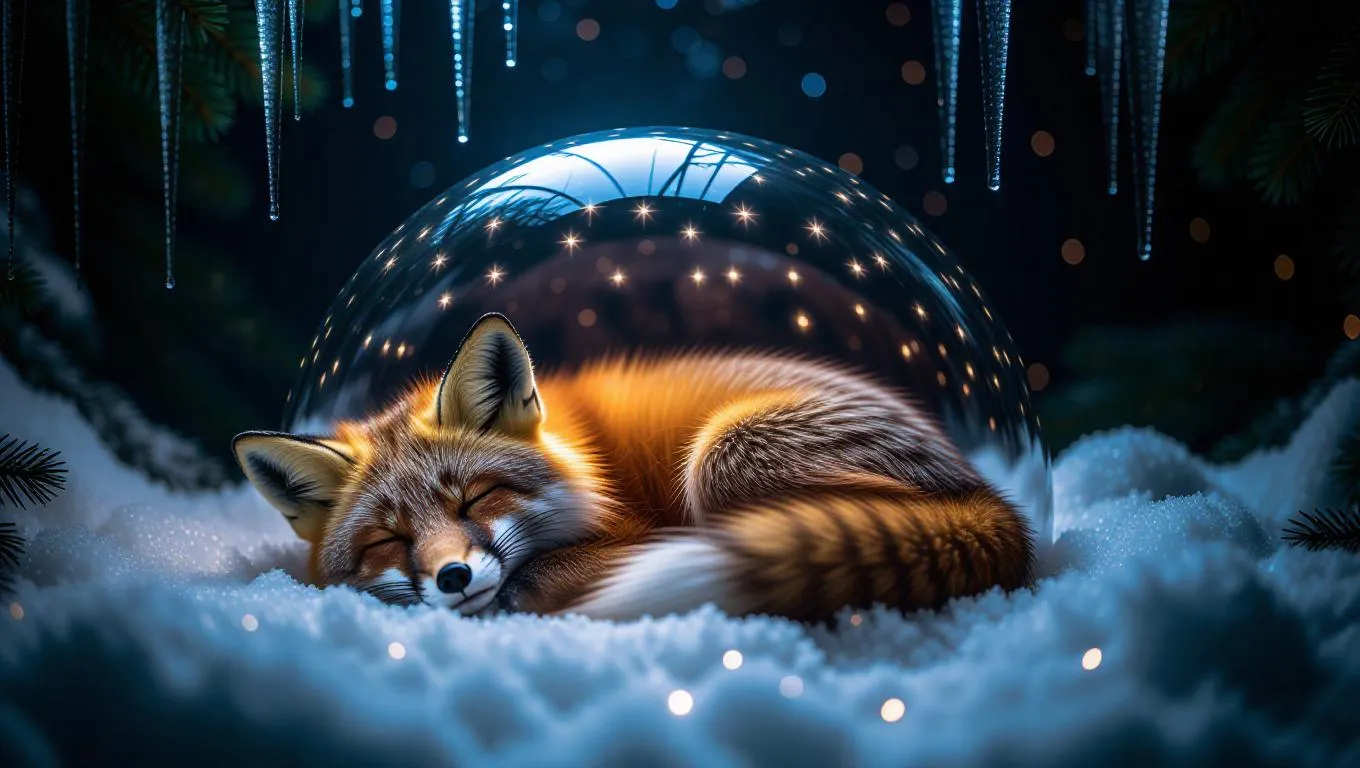 A sleeping fox curled inside a translucent crystal dome, surrounded by icicles and soft, fluffy snowflakes, creating a magical, winter wonderland atmosphere