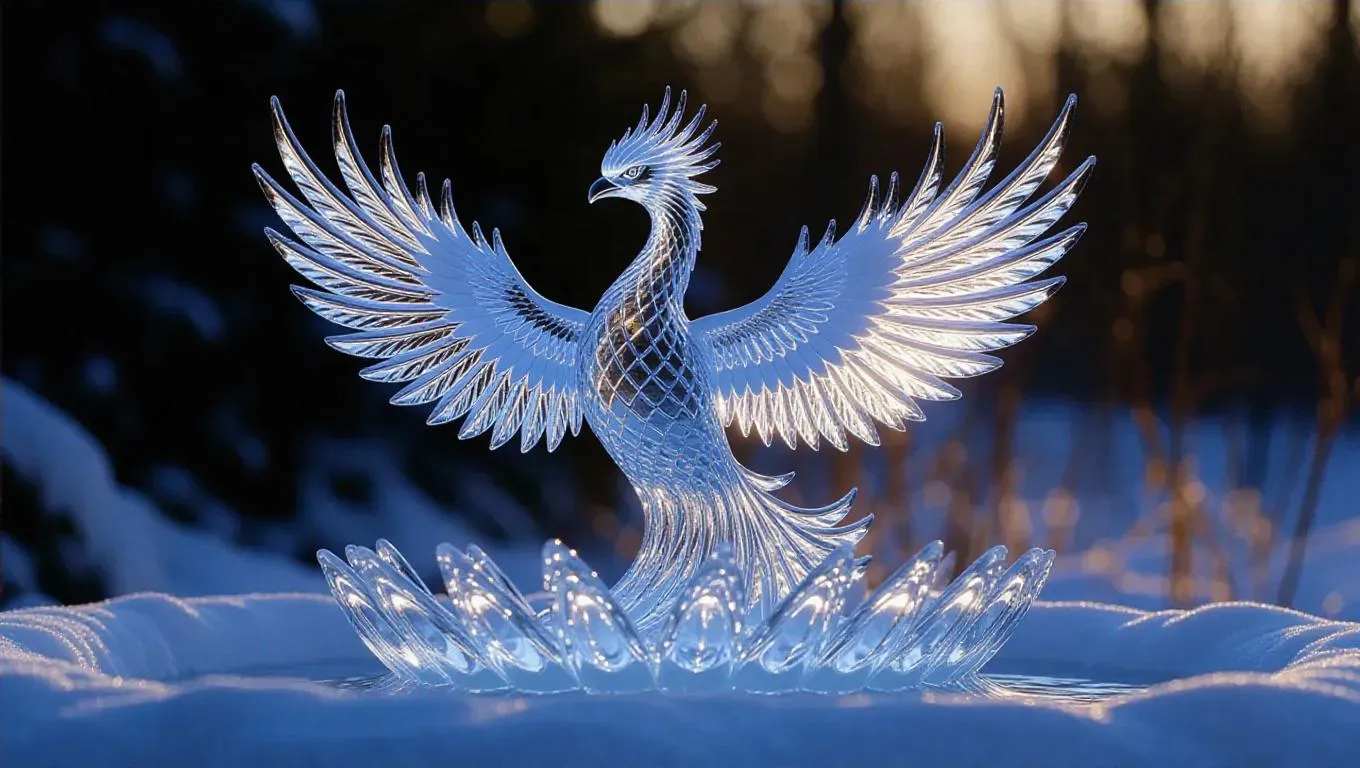 A majestic frozen fountain shaped like a phoenix, water suspended mid-motion in clear crystal curves, surrounded by a blanket of snow, with soft, diffused light casting a magical glow, emphasizing the intricate ice formations