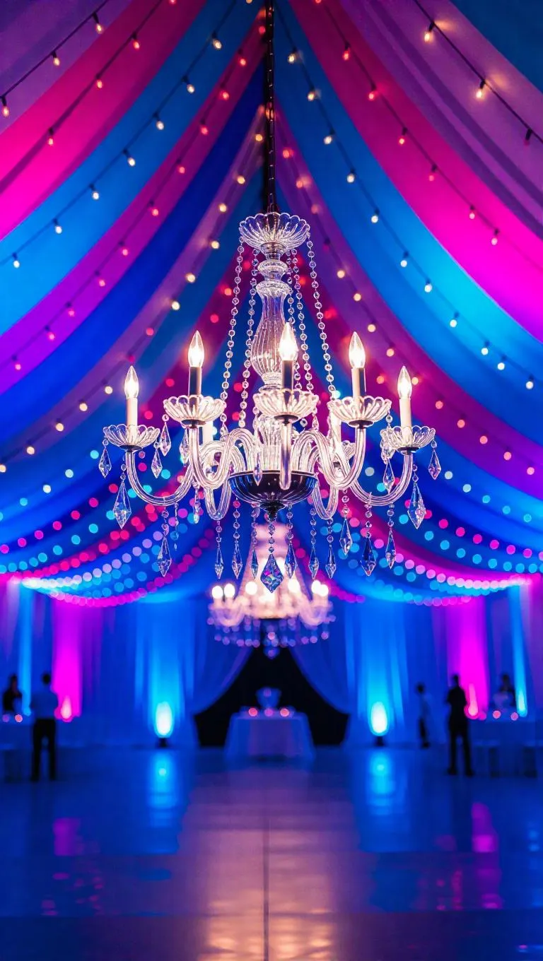 An elegant chandelier crafted entirely from shimmering ice crystals, suspended in a vibrant festival tent with colorful banners and lanterns, reflecting a mesmerizing array of light and shadows, creating an ethereal, frosty aura in the celebratory venue.