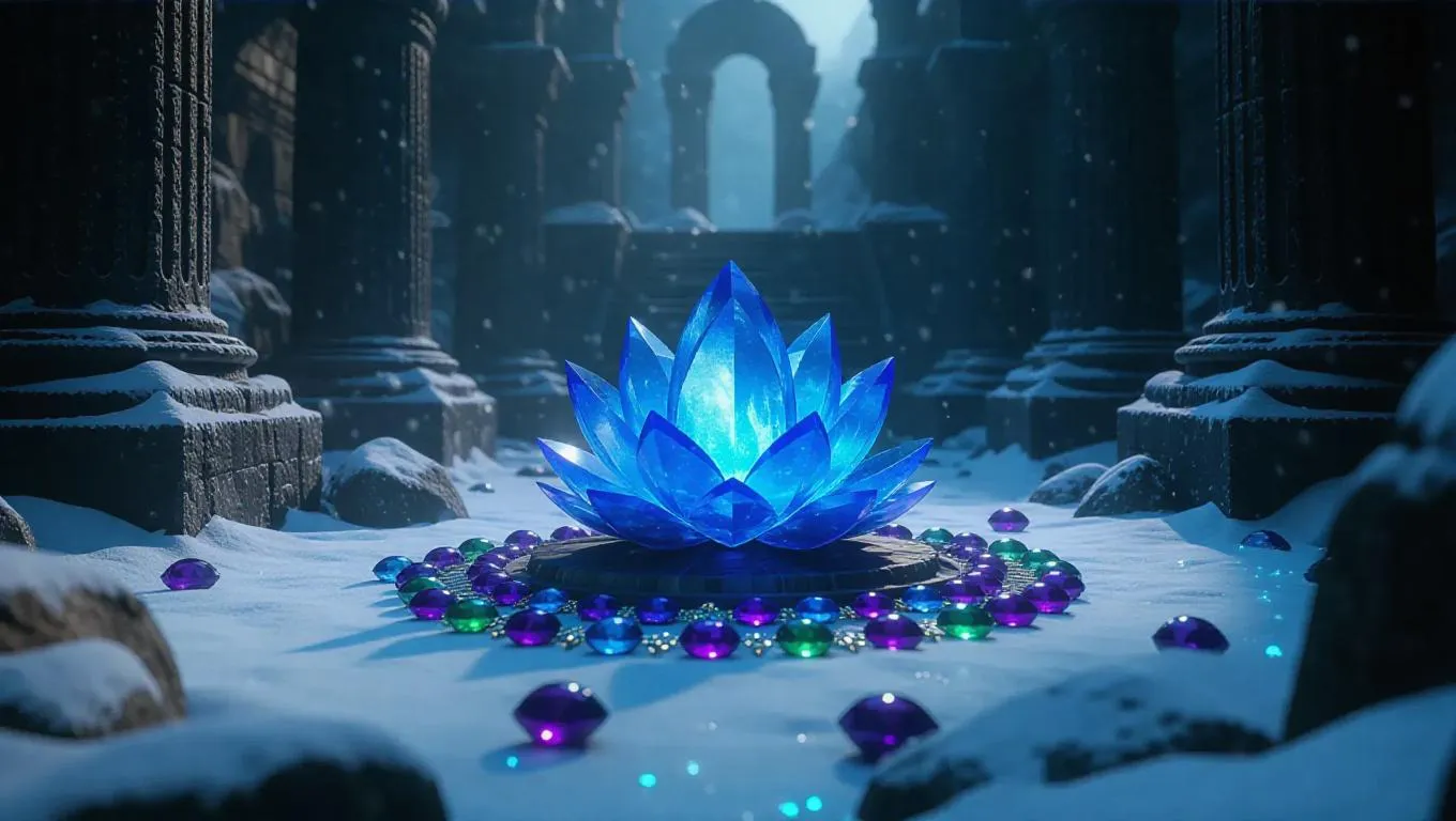 A single ethereal blue crystal flower emerging from a fissure in the rocky ground, encircled by delicate, colorful jewels. The flower radiates a subtle glow, casting a magical aura over the frosty ruins of an ancient temple, where icy pillars rise from the snow-covered floor.