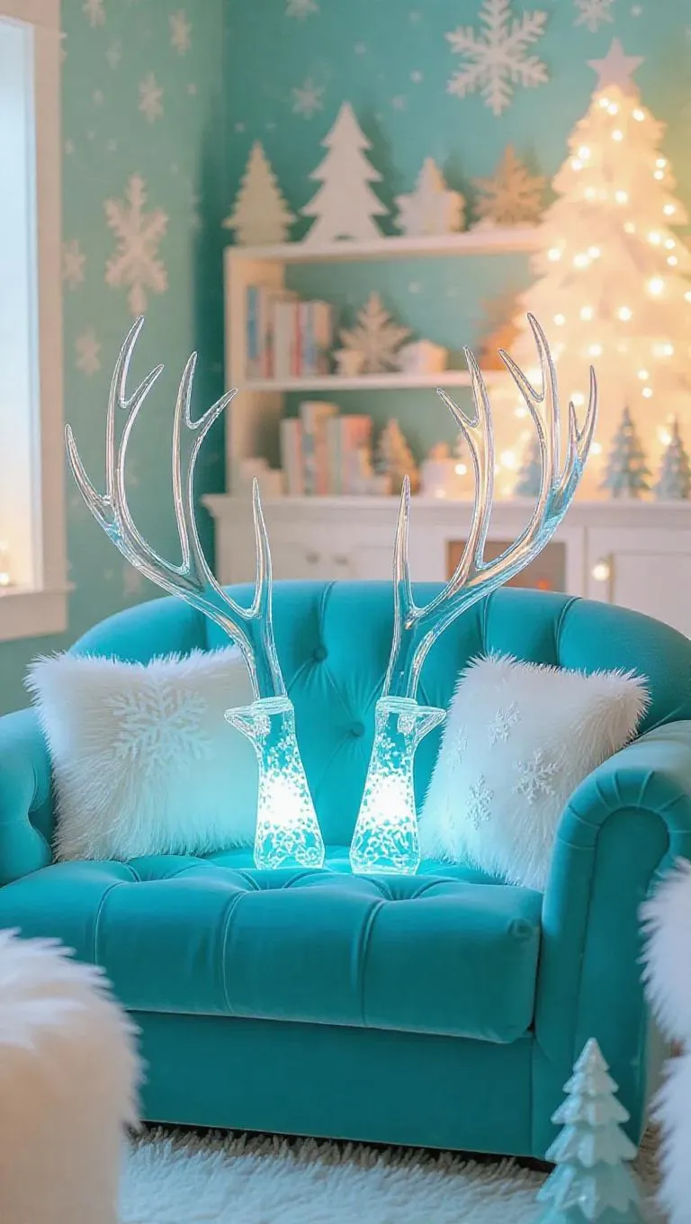 A pair of intricate crystal antlers, well-placed on a plush couch in a whimsical snow-themed playroom, glowing with a pastel teal light, surrounded by playful decorations and fluffy snowflakes, creating a cheerful and lighthearted atmosphere, set in a fun-filled environment with imaginative ice-themed activities and colorful accents.
