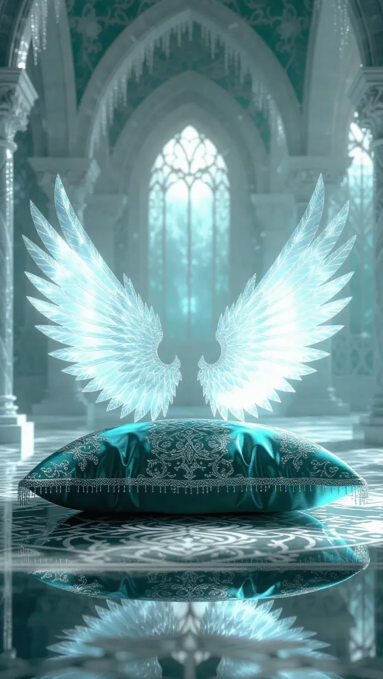 A pair of stunning ice crystal wings, gently balanced on a luxurious brocade pillow in a splendid cold palace, emanating a faint teal radiance, flanked by frosty arches and sparkling icicles, generating an ethereal and spellbinding atmosphere.