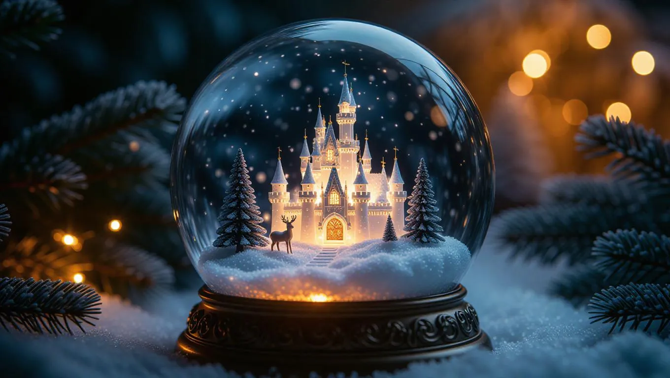a small, glowing snow globe, illuminated by pale, iridescent light. Inside, a miniature ice castle glows with unique details, surrounded by a flurry of heavy snowflakes, with a tiny deer watching the snow, creating a peaceful and enchanting snowy meadow.