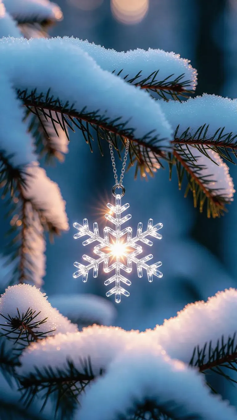 A snowflake-shaped crystal pendant, resting delicately on the frost-covered branches of a winter forest, glowing faintly with an ethereal inner light, casting soft, shimmering reflections on the snowy branches, surrounded by a serene, peaceful woodland.