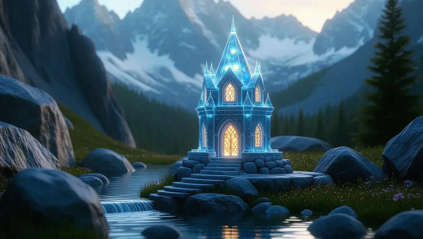 A delicate fairy tower crafted from intricately carved ice, featuring glowing crystal windows that shimmer with ethereal light, nestled in a peaceful mountain valley, surrounded by rocky peaks and glistening streams.