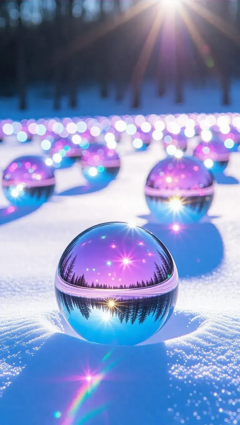 A vast snowy field adorned with scattered floating crystal orbs, each orb shimmering and reflecting a rainbow in a unique, vibrant hue, creating a mesmerizing, otherworldly landscape