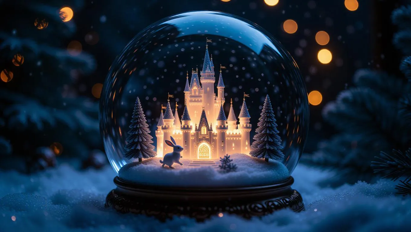 a small, glowing snow globe, illuminated by bright, warm light. Inside, a miniature ice castle reflects with intricate details, surrounded by a flurry of swirling snowflakes, with a tiny rabbit hopping through the snow, creating a whimsical and enchanting winter scene.