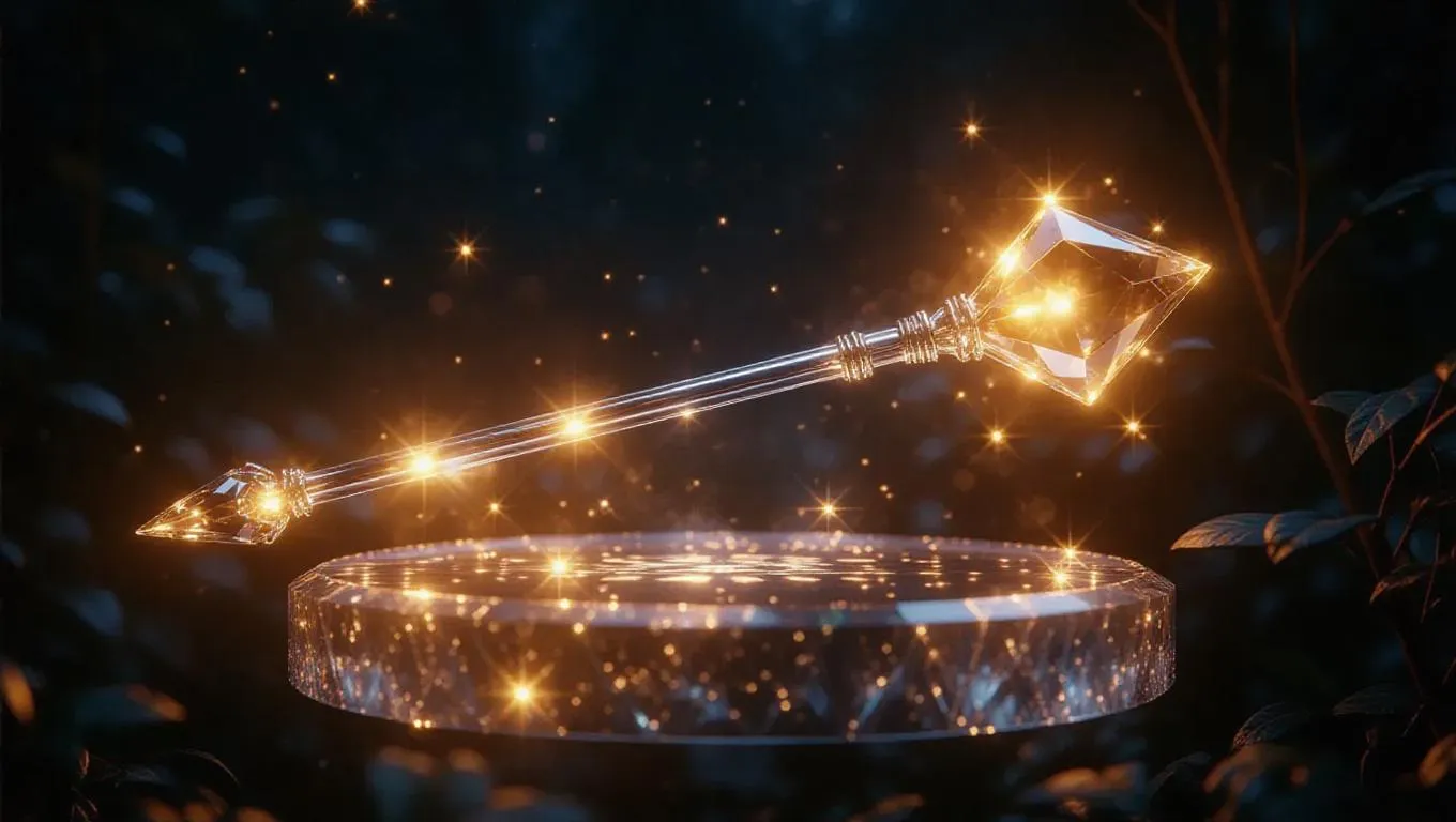 A majestic fantasy magic wand embedded in a crystal pedestal, the wand crafted from pure, glowing diamond, emitting a mesmerizing aurora of dazzling light, surrounded by swirling sparkles and a misty, enchanted atmosphere, set in a mystical grove under celestial stars.