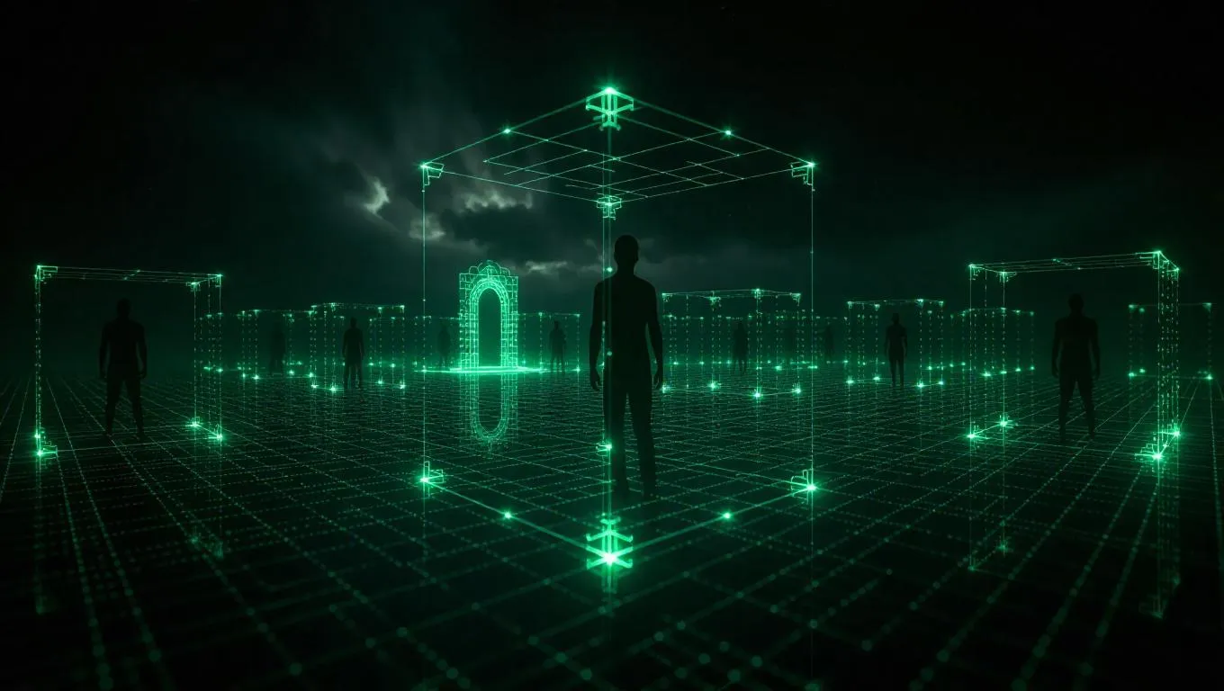 AI-generated surreal digital artwork of the Matrix as a multidimensional prison: neon green and blue energy grids, trapped human silhouettes in glowing cubes, cosmic backdrop with ancient symbols and binary code. A distant glowing doorway symbolizes escape. Cinematic lighting, mystical atmosphere, 8k resolution—crafted with AI-powered creative tools for vivid, high-detail fantasy visuals.