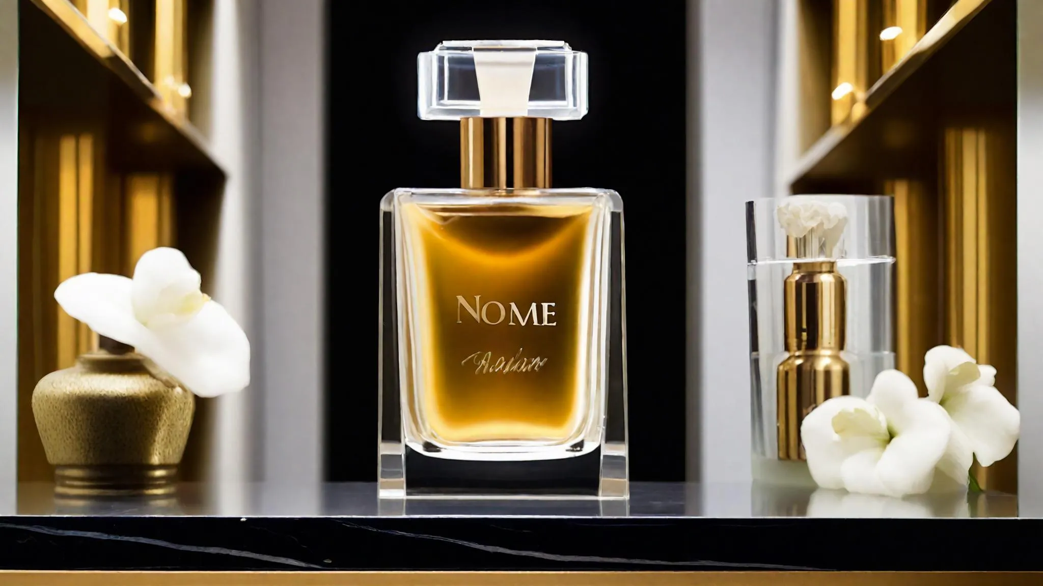Capture luxury with a sleek, golden-filigree perfume bottle on marble, bathed in soft light highlighting amber fragrance. Velvet drapes, brass accents, and art deco patterns frame this high-end boutique scene. Crisp product details pop against creamy bokeh, crystal chandeliers, and blurred shoppers—ideal for premium beauty branding or luxury product visuals.