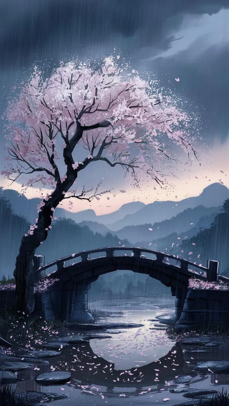 Chinese-style plum blossom tree stands resilient beside a broken bridge at an ancient postal station during a stormy dusk. Wind, cold rain, and trembling petals contrast delicate beauty with enduring strength. Rendered in soft ink-wash or ethereal anime aesthetic, this image symbolizes quiet perseverance and unyielding inner beauty amidst desolate nobility. Misty mountains, poetic solitude.