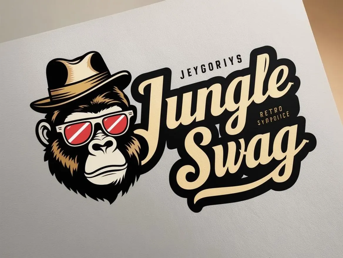 Brand logo for "Jungle Swag" with diverse typography. Retro, elegant style. A little gorilla head adorned with retro sunglasses and a stylish hat, exuding a vintage flair. The logo features a mix of bold, cursive, and serif fonts, creating a dynamic and eye-catching design.