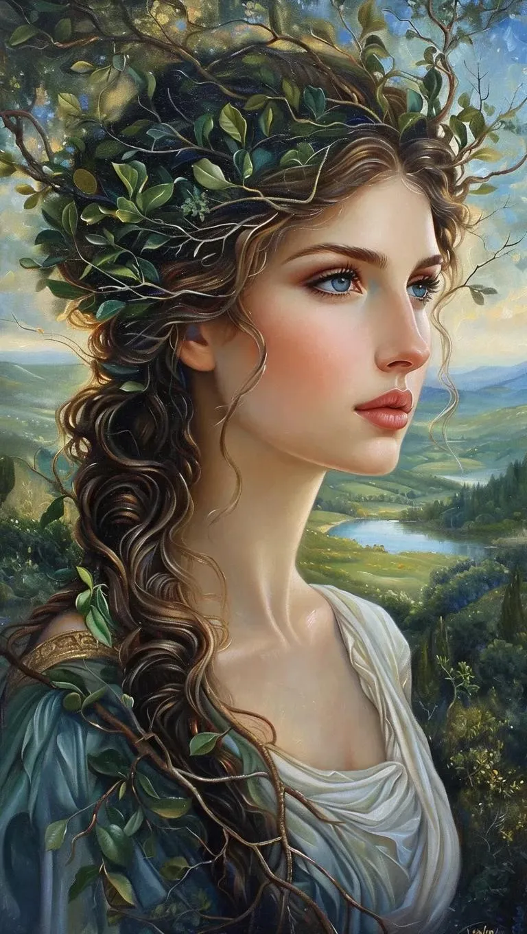 Create surreal AI art with VivaGO.ai: Generate a Greek goddess blending feminine grace and masculine strength, adorned in organic branches, rendered in rich oil painting texture. Perfect for mythological themes, mixed-gender deity designs, and nature-inspired digital artistry.