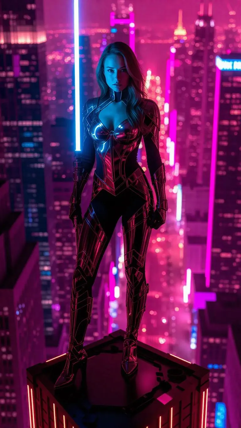 Kate Hudson as a FUTURISTIC Super Hero Warrior. Full shot. She stands atop a neon-lit skyscraper, laser sword in hand, overlooking a sprawling metropolis, vibrant colors, dynamic composition. Her skin tight leotard armor gleams with intricate details. A masterpiece, 8k resolution, trending on neon, vibrant, detailed.