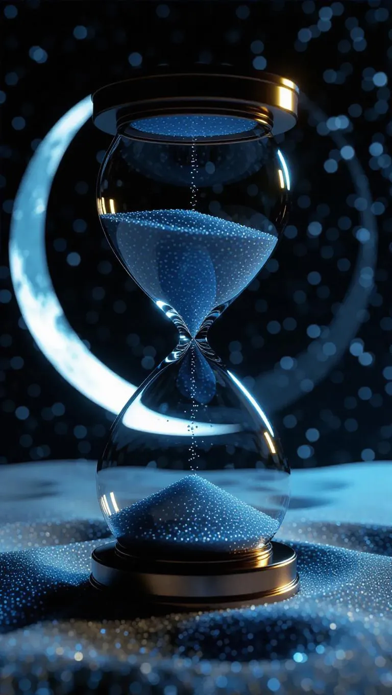 Suspended between two luminous moons, a celestial hourglass spills radiant crystal sand, each grain a frozen moment in time. As the grains cascade, they unveil visions of alternate futures, shimmering with ethereal light. When it tips, reality reshapes, reflecting the destiny of the first falling sand.
