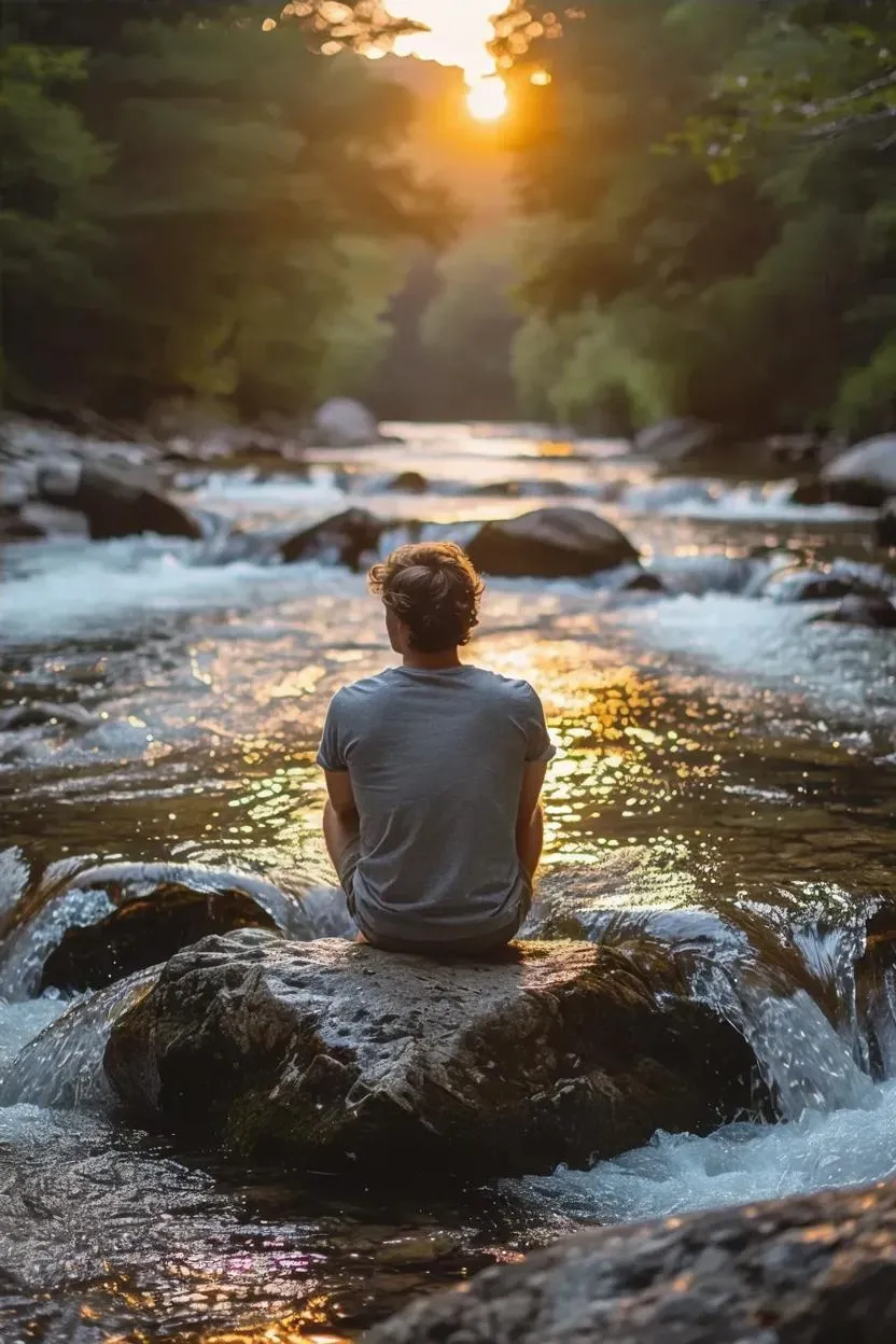 Generate a contemplative AI image of a man sitting by a serene river, reflecting on career challenges. Vivago.ai transforms career tension into striking visuals, blending nature's calm with professional stress themes. Ideal for illustrating mindfulness, work-life balance, or career crossroads in digital artwork. Create evocative imagery with AI-powered precision.