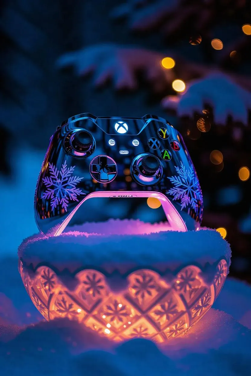 Crystal statuette of a beautifully crafted Xbox joystick, exquisitely detailed with intricate patterns, set on a sleek snow pedestal, bathed in soft ambient lighting, casting a mesmerizing glow that accentuates its elegant form and modern design.