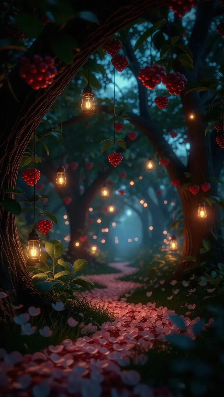 n enchanting world where trees grow upside-down, berries hanging like glowing lanterns, casting a soft, warm light. The forest floor is carpeted with soft cream petals, and the air is filled with a sweet, preserved aroma. Twinkling fireflies dance around the berry-lanterns, adding a magical touch to the scene.