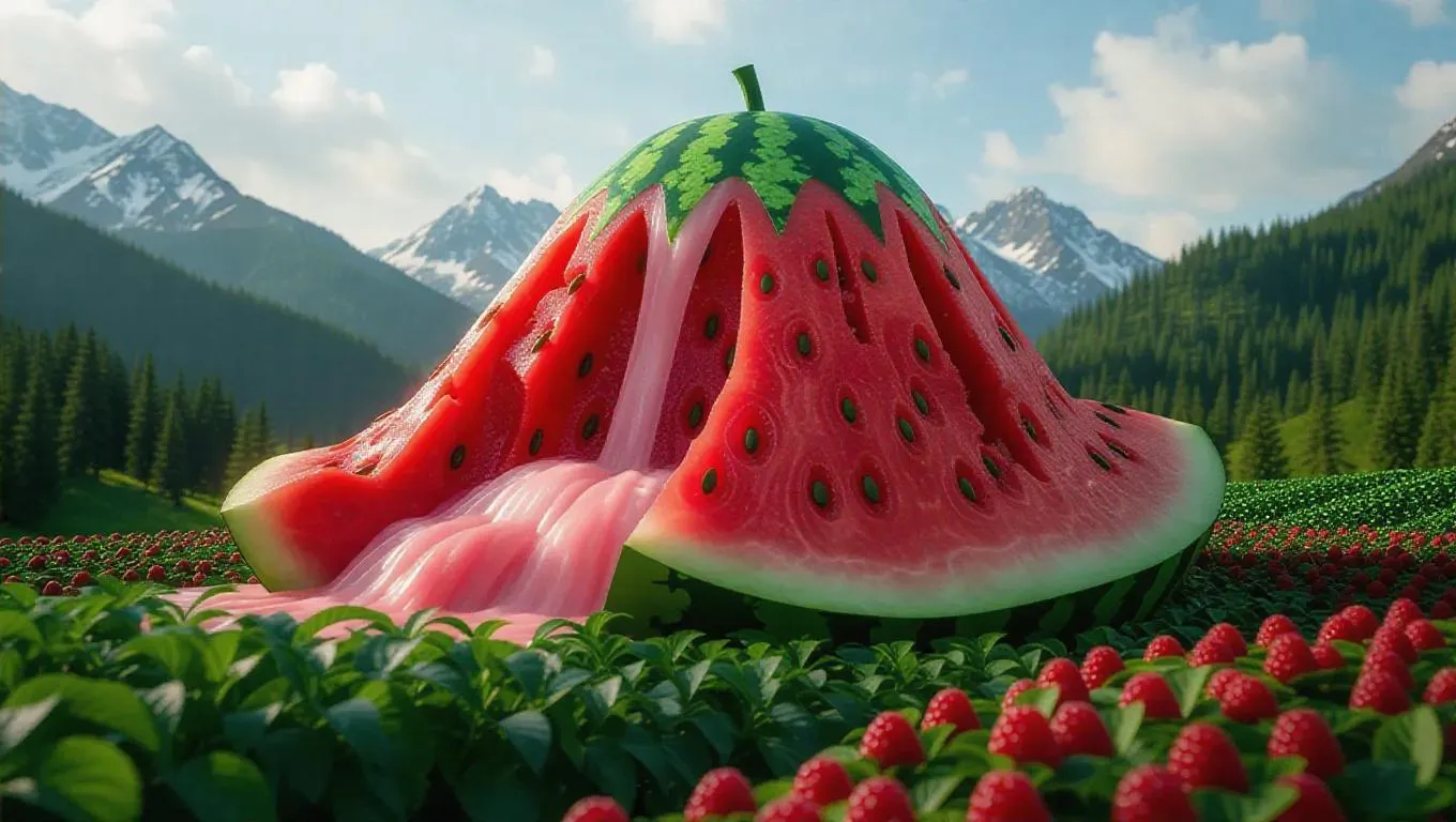 A mountain carved from a giant watermelon, with cold watermelon soup cascading down its peak, surrounded by apple orchards and raspberry fields.