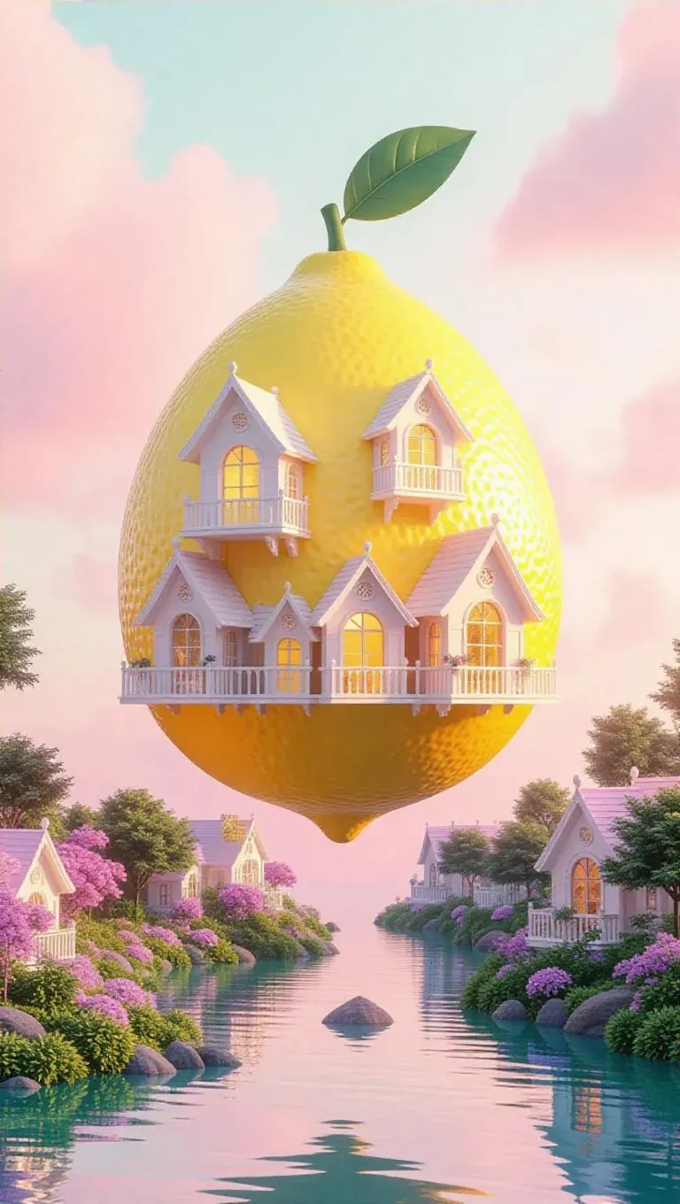 A whimsical floating library shaped like a giant lemon, adorned with tiny shell-shaped houses and rivers flowing with vibrant juice, suspended under a dreamy pastel sky, with fluffy.
