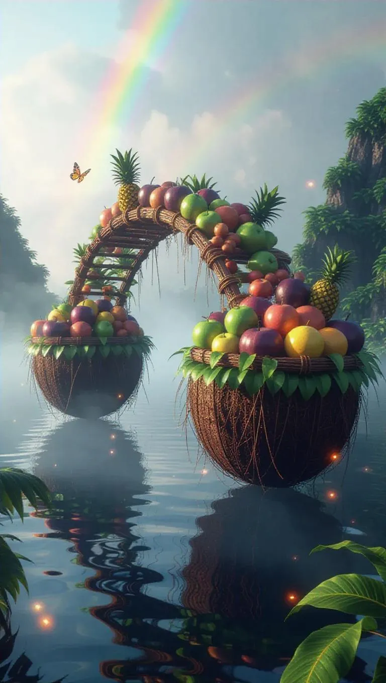A whimsical bridge intricately woven from shimmering coconut husks, connecting two floating fruit islands adorned with various, colorful fruits. The islands hover above a foggy, enchanted sea, with a rainbow arching overhead and glowing fireflies dancing around the bridge.