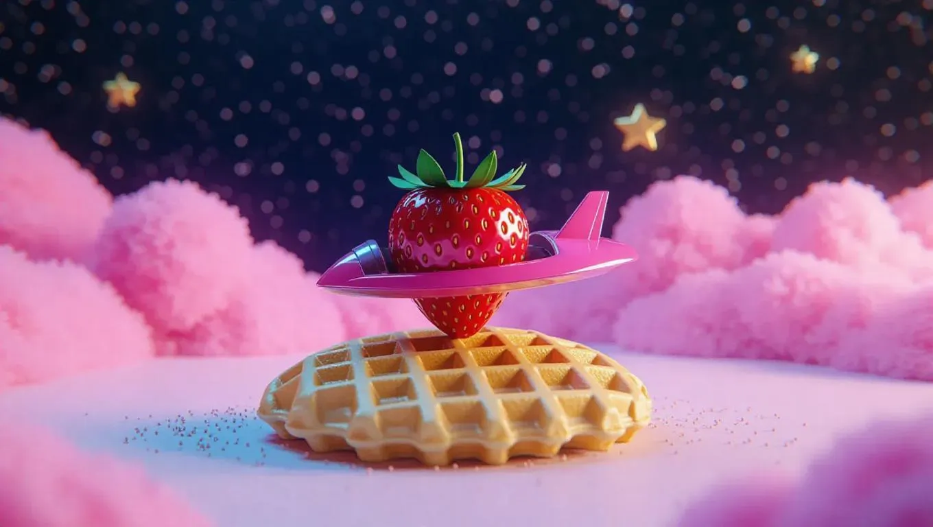 A whimsical strawberry-shaped spaceship gracefully landing on a golden, waffles moon, surrounded by a sprinkle of bright stars, with a soft, pink sky creating a dreamy, playful atmosphere.