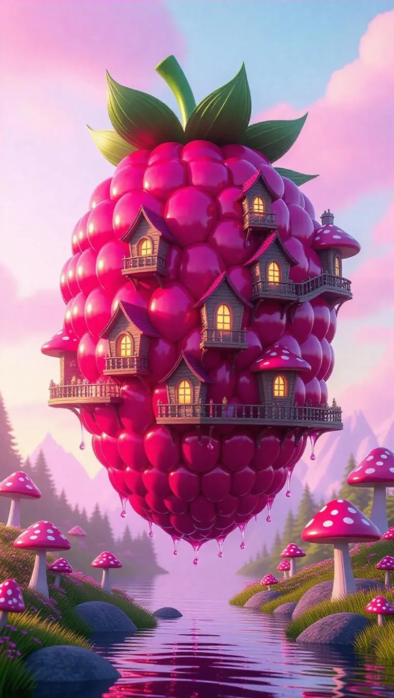 A whimsical floating library shaped like a giant raspberry, adorned with tiny mushroom-shaped houses and rivers flowing with vibrant juice, suspended under a dreamy pastel sky, with fluffy.