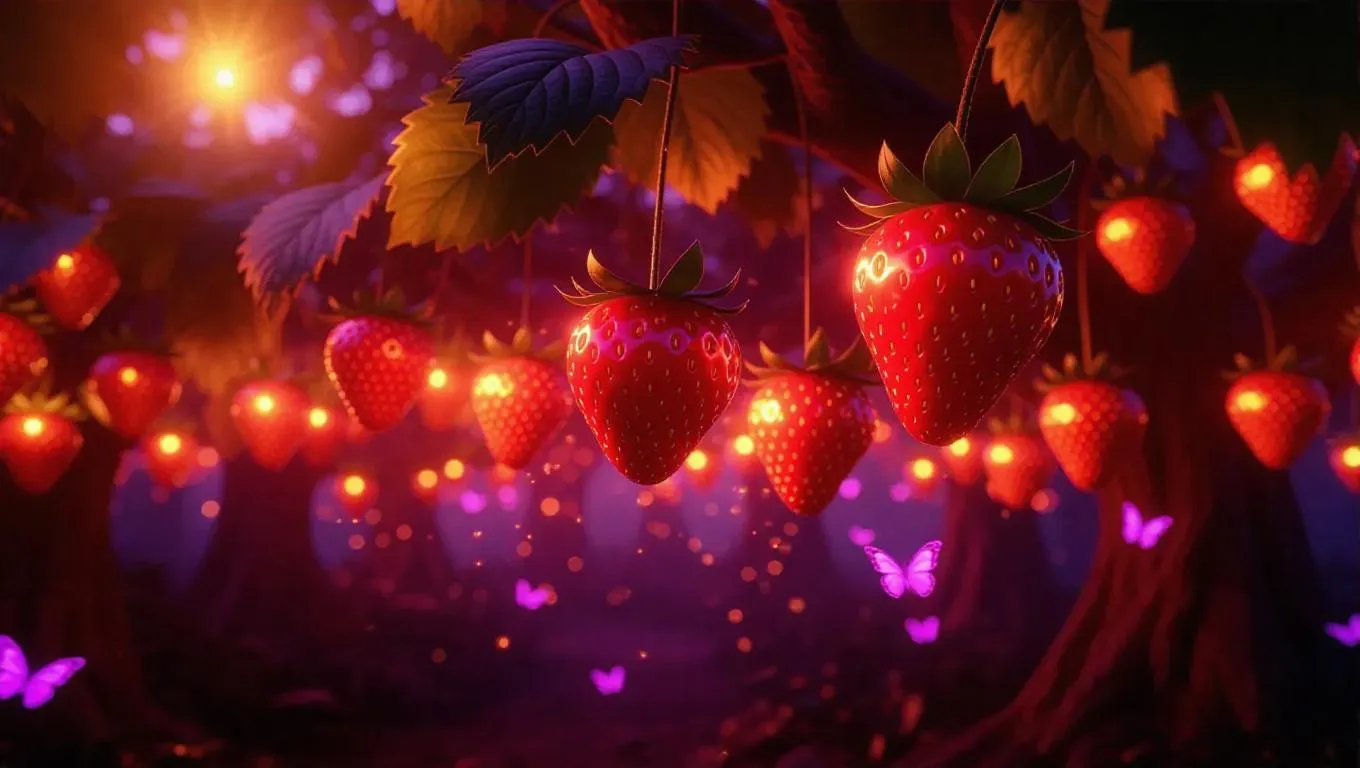 An enchanting world where trees grow upside-down, strawberries hanging like glowing lanterns, casting a soft, warm light. The forest is alive with colorful butterflies, and the air is filled with a sweet, sugary aroma. Twinkling fireflies dance around the strawberry-lanterns, adding a magical touch to the scene.
