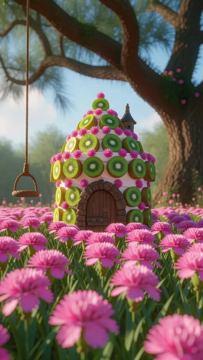 A whimsical little fortress crafted from plump kiwis and creamy frosting, nestled in the heart of a lush carnation field, surrounded by a sea of vibrant pink carnations and delicate wildflowers, with a tire swing hanging from an old oak tree, exuding a sweet, enchanting aroma under the cool winter sun.