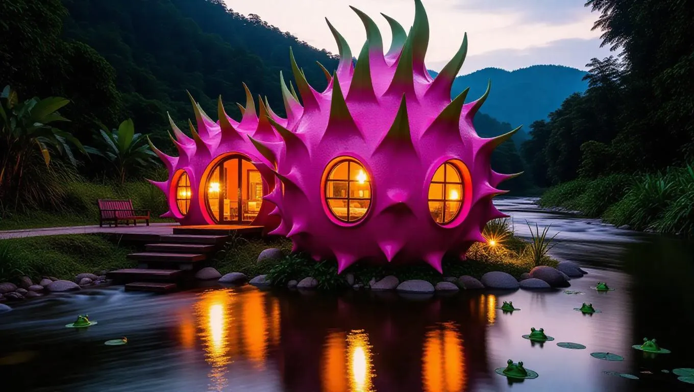 A dragonfruit-shaped house situated beside a flowing river, its vibrant pink exterior and green spikes contrasting against sparkling water, windows glowing softly as frogs croak nearby, creating a lively and enchanting scene.
