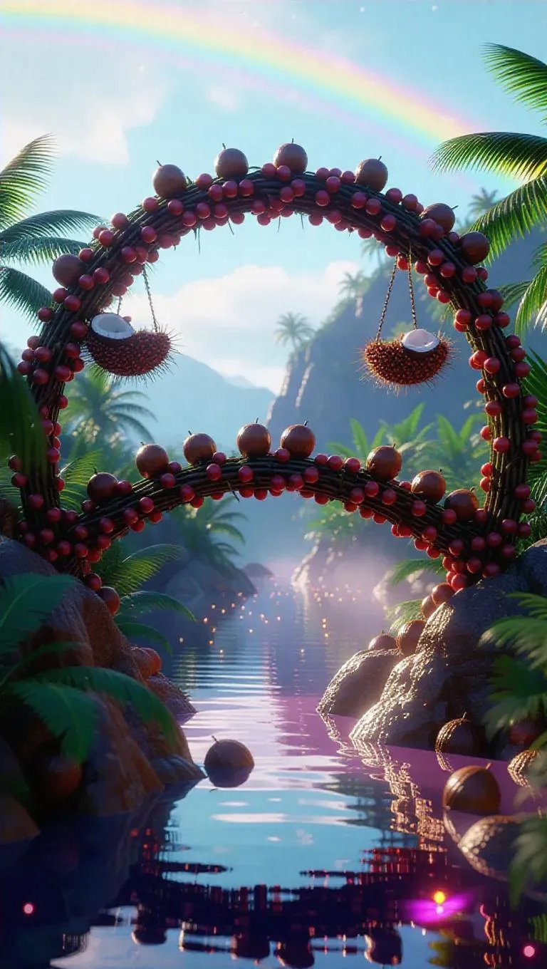 A whimsical bridge intricately woven from glimmering berry vines, connecting two floating fruit islands adorned with cool, refreshing coconuts. The islands hover above a misty, enchanted desert oasis, with a rainbow arching overhead and glowing fireflies dancing around the bridge.