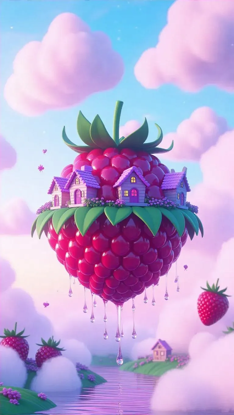 A whimsical floating oasis shaped like a giant raspberry, adorned with tiny ant-shaped houses and creeks flowing with berry nectar, suspended beneath a candy-colored sky, with swirls of pastel clouds and a soothing breeze.