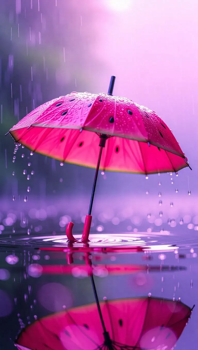 A charming umbrella shaped like a watermelon slice, open under a light mist, with droplets gently glistening on its vibrant pink and green surface, set against a foggy, mysterious backdrop.