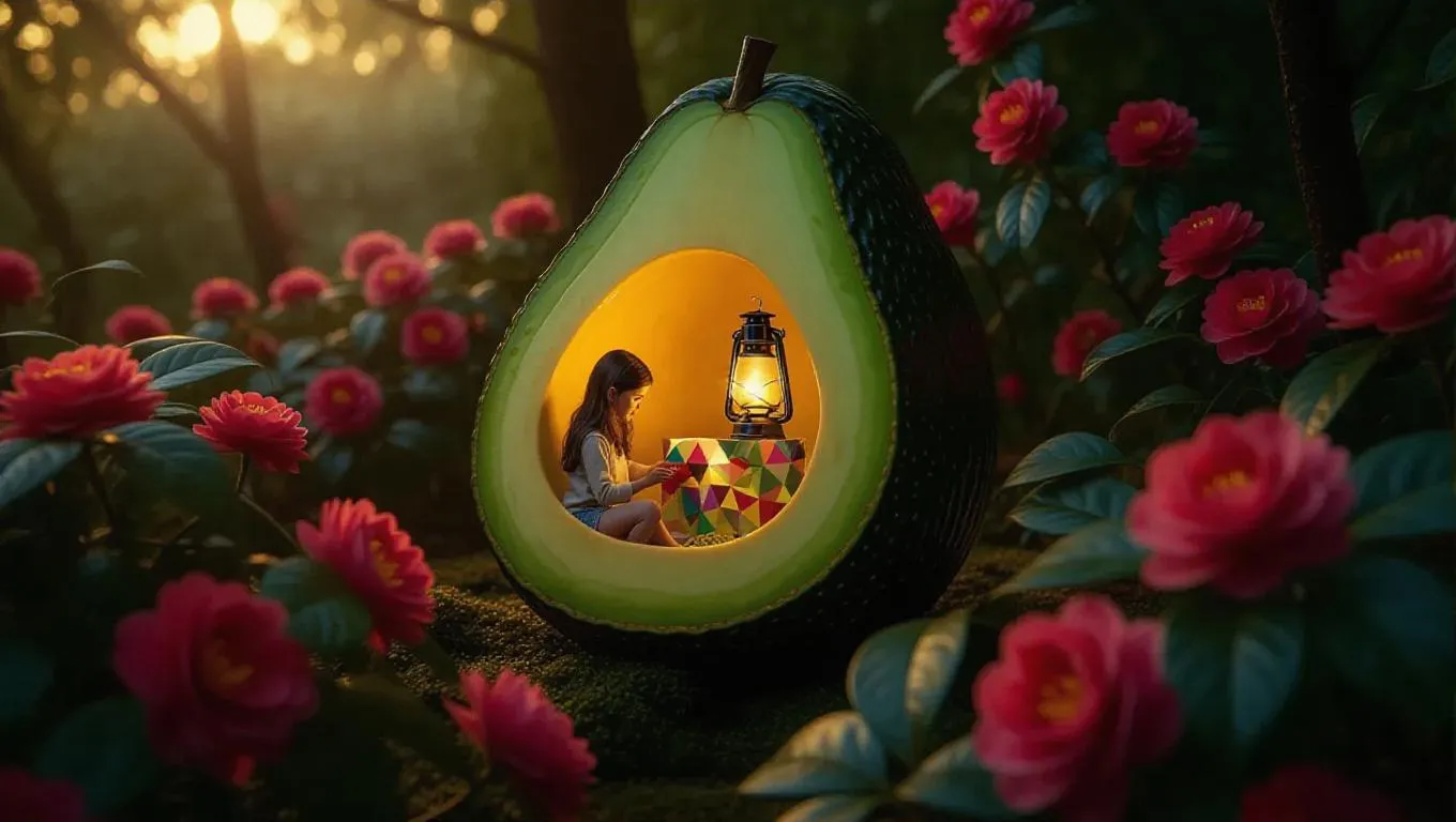 A cozy cabin crafted from a halved avocado, nestled among vibrant camellia bushes. Inside, a girl plays with a geometric puzzle, the warm glow of a small lantern casting a gentle light, creating a serene and enchanting atmosphere.