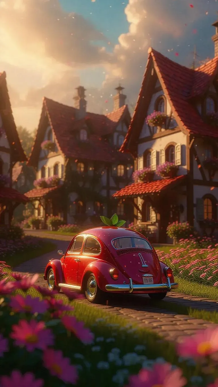 A whimsical strawberry-shaped sedan gliding through a quaint village planted with vibrant flower patches, leaving a mystical trail of sparkling berry glitter, while golden rays filter through colorful skies and smiling villagers wave from blossom-themed houses